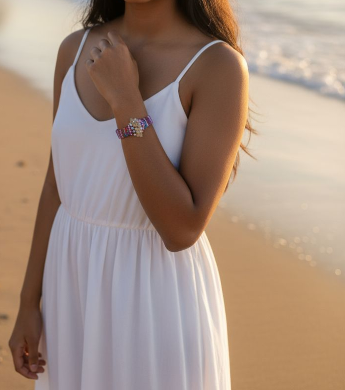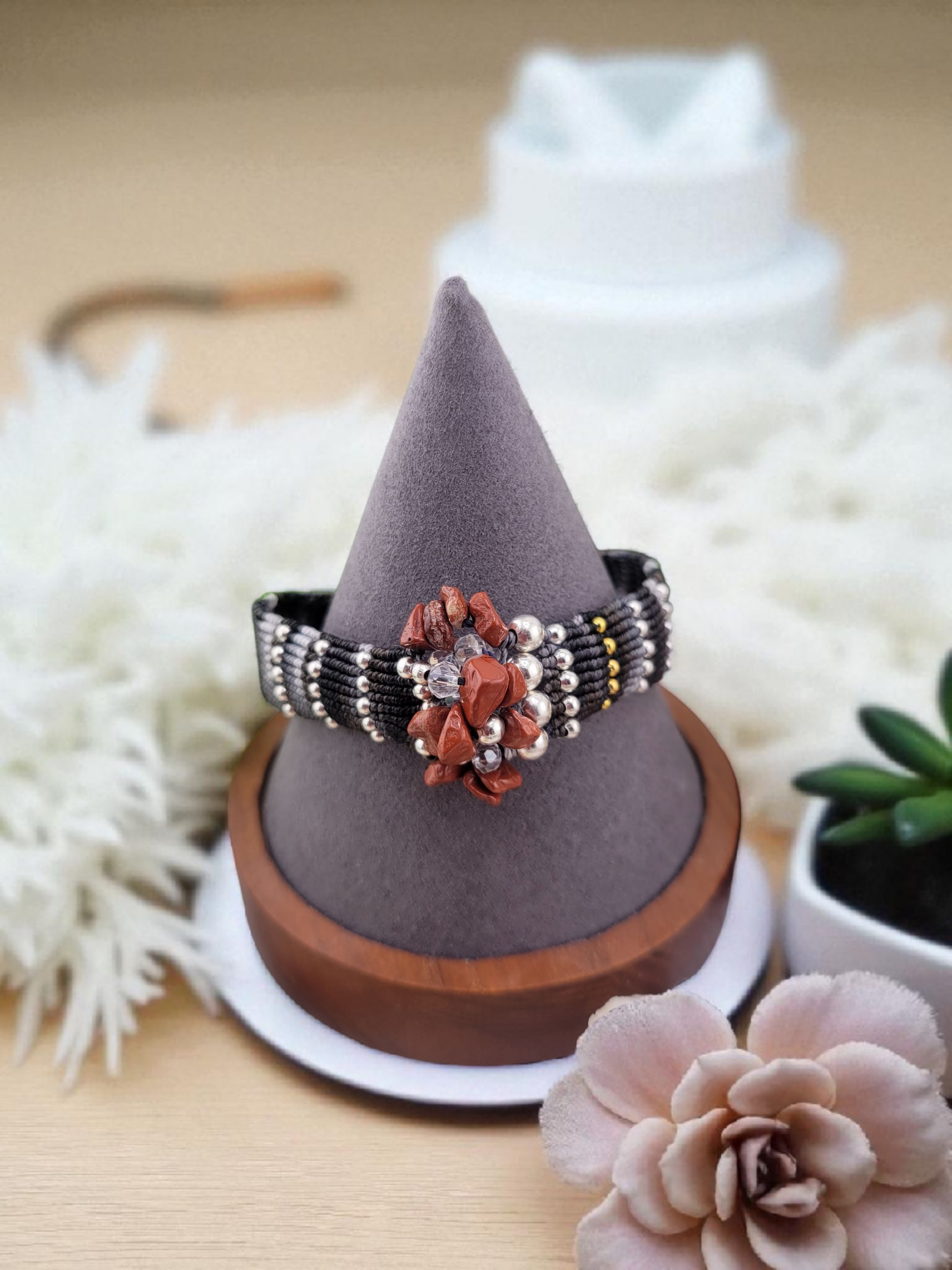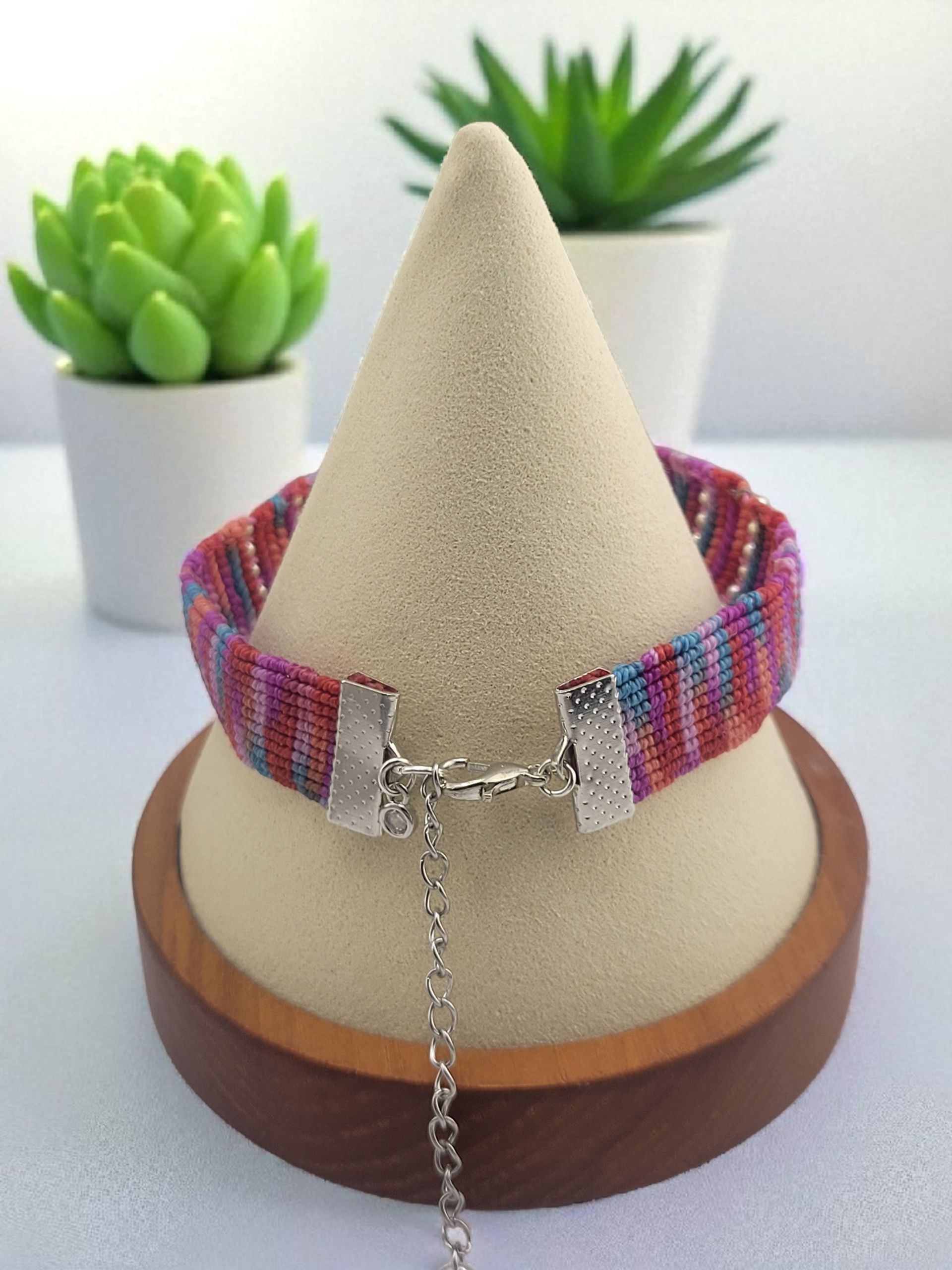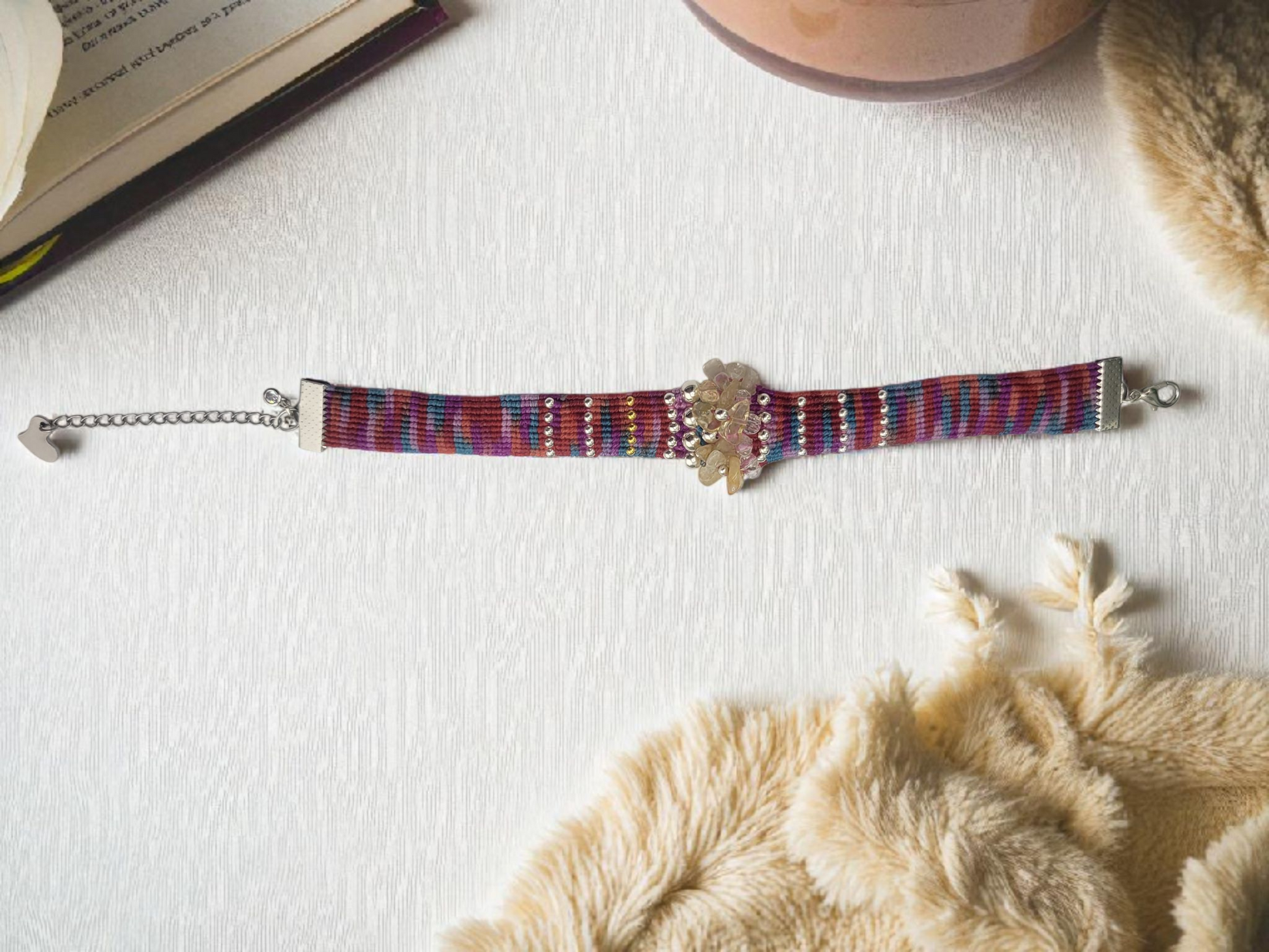 Handmade woven bracelet. The bracelet is a cuff style, made of colorful threads in a striped pattern with 18k gold plated metal gold or stainless steel silver beads woven throughout. In the center, there are decorative cluster gemstone beads and czech beads. The bracelet has a silver-toned or gold-tone metal clasp with an 1.5 inches adjustable chain.