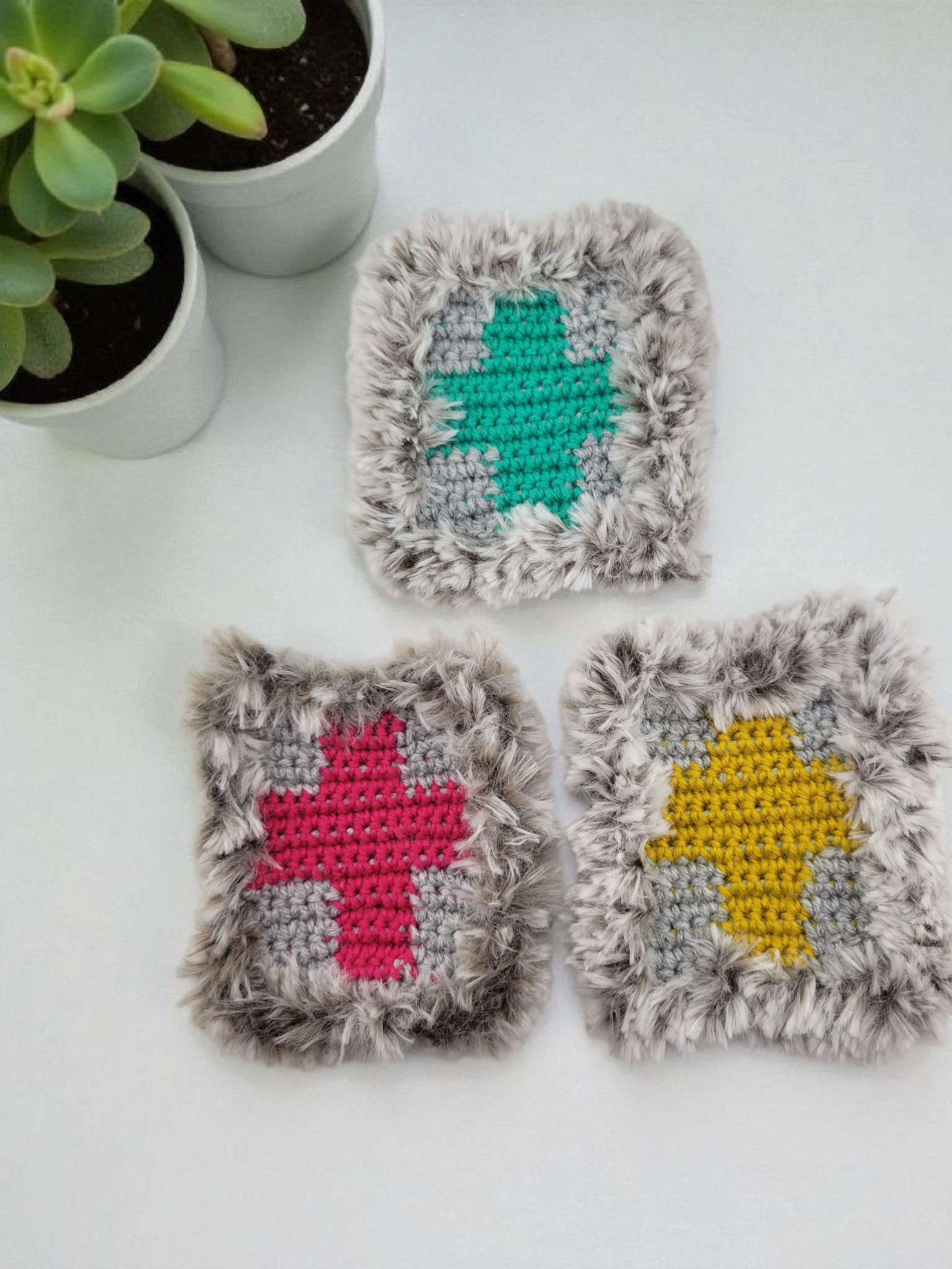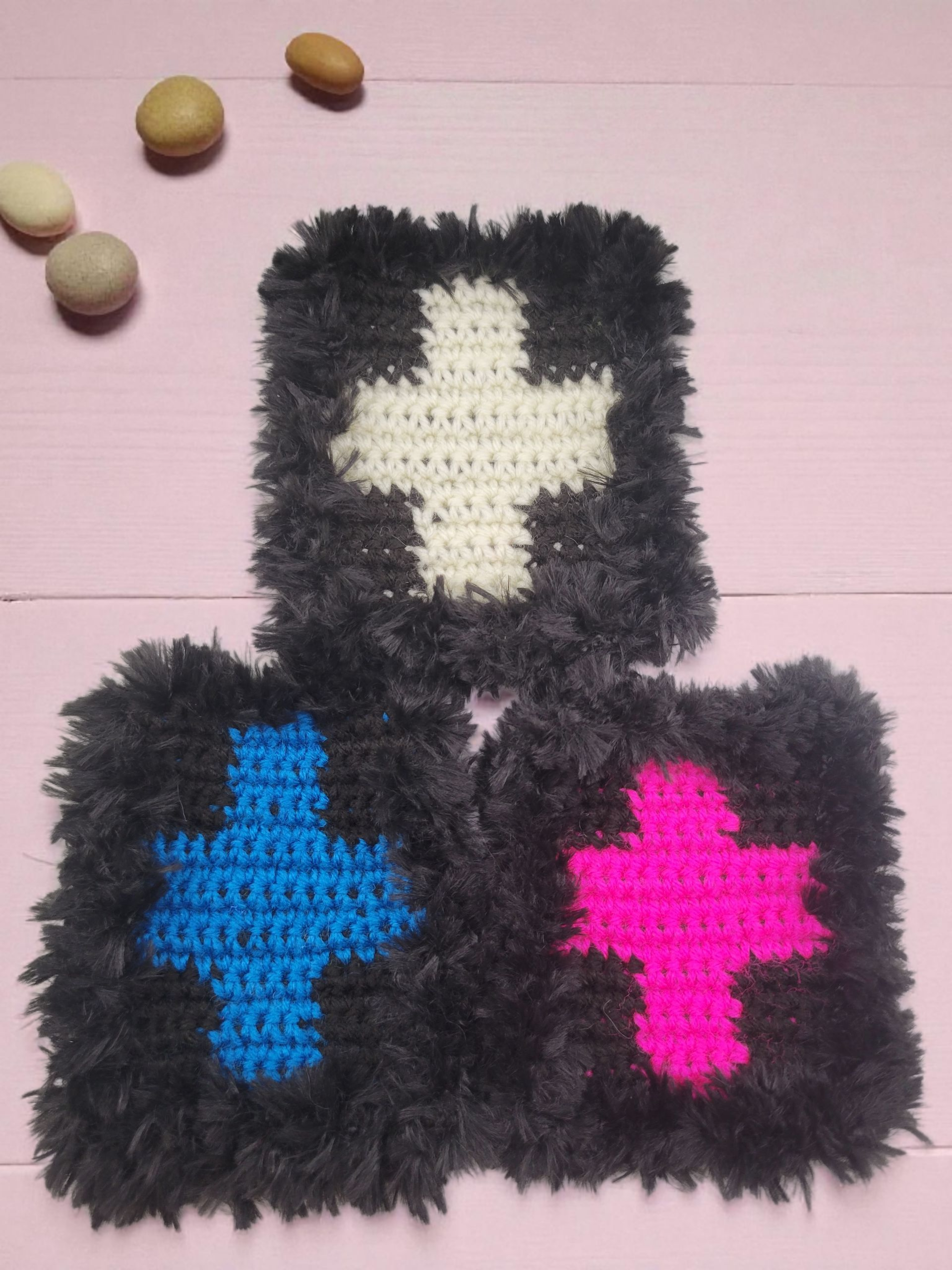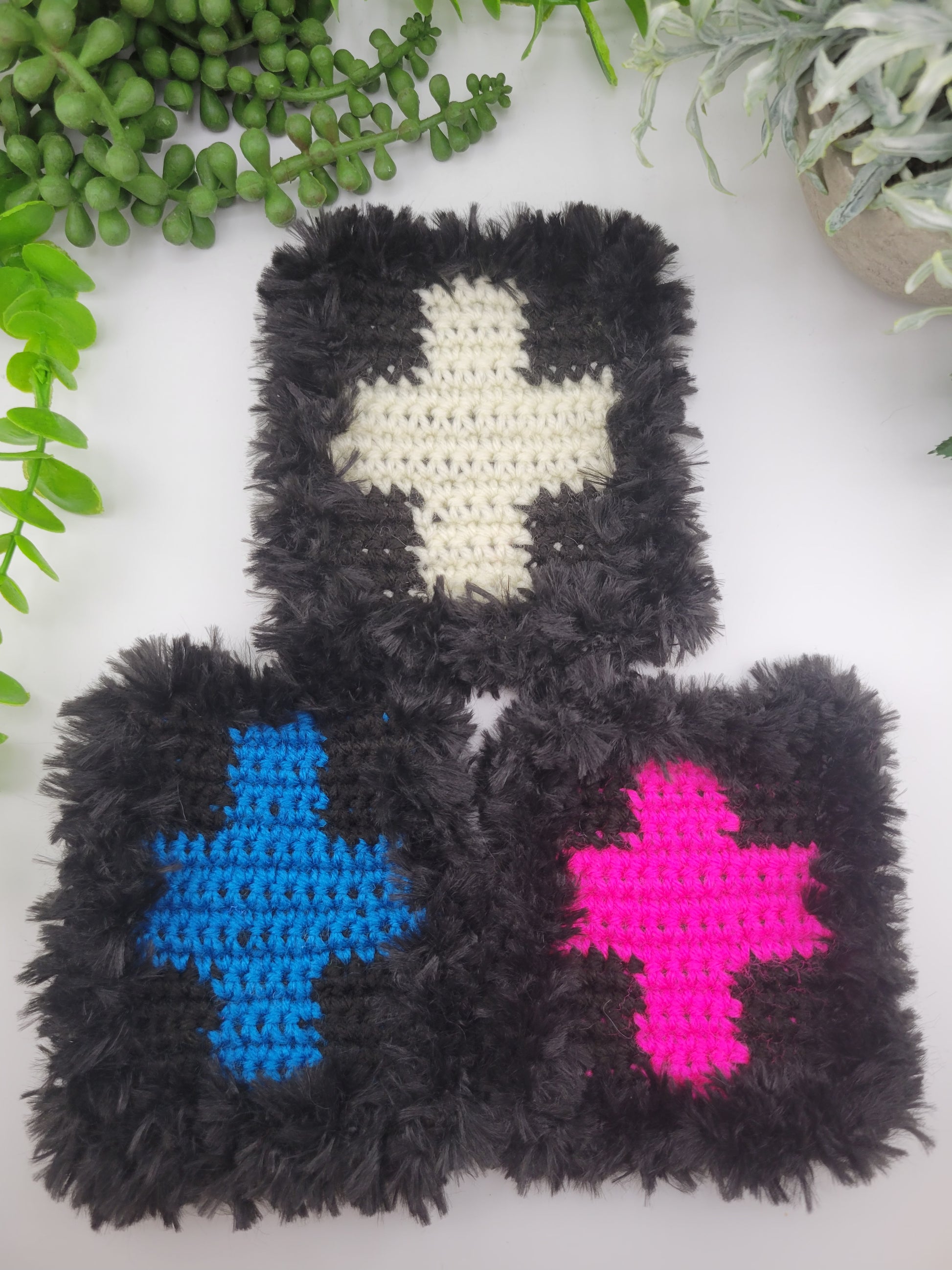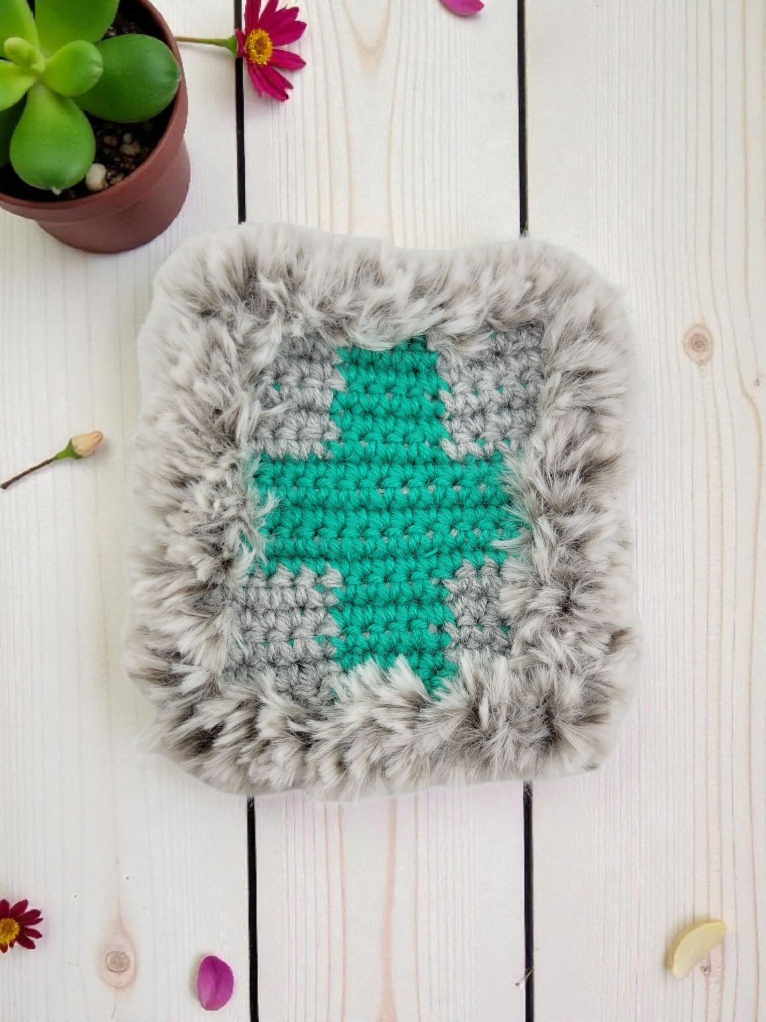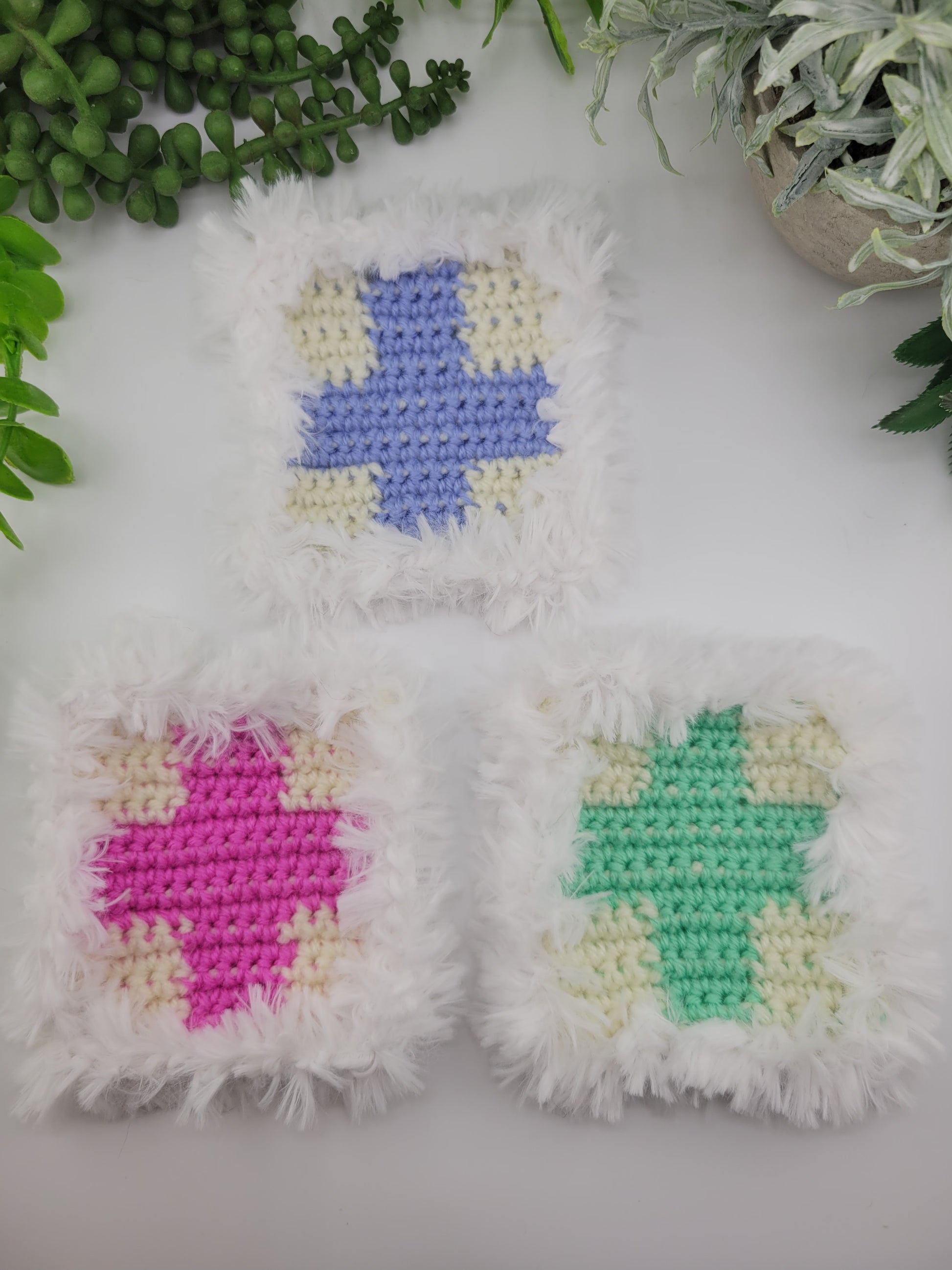 Crochet Coaster with a cross motif, trimmed with a fluffy or faux-fur yarn border.