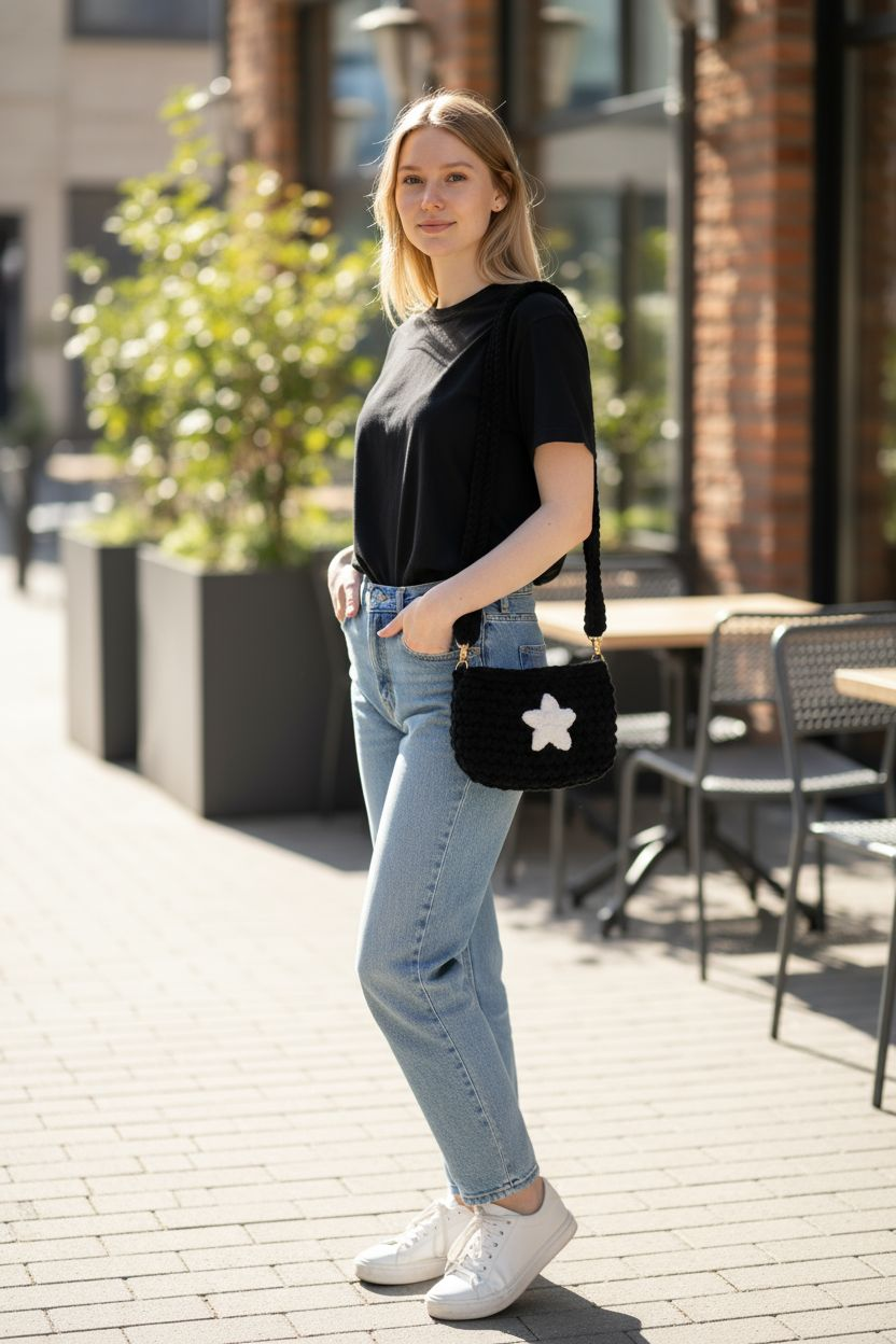 Crochet Purse, Shoulder bag, Adjustable Strap 29"-60"(73-150cm), Detachable Strap, Length 8"(20cm) Width 5.5"(15cm), Star design, tassel with wooden bead